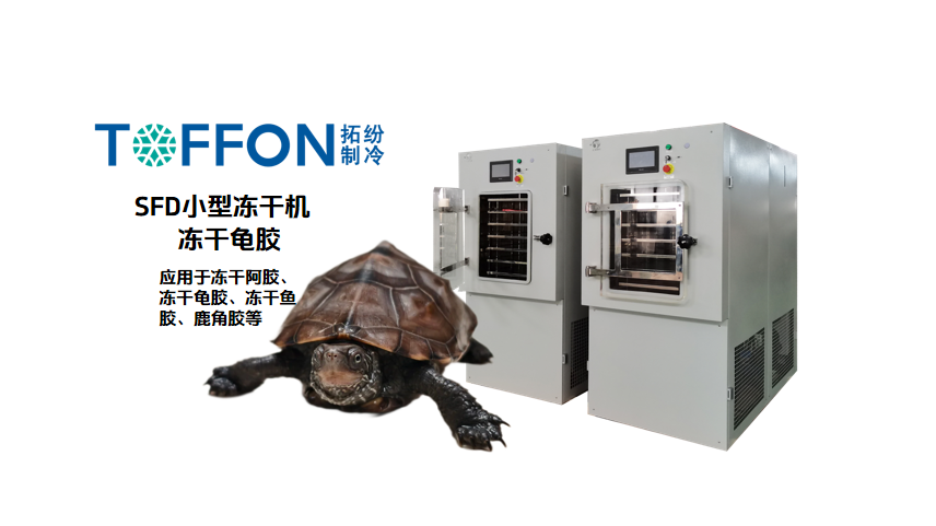 龟甲胶是乌龟的背甲及腹甲经过熬煎浓缩制成的固体胶块,富含骨胶原、酶和多种氨基酸等,具有滋阴潜阳、益肾强骨、养血补心、固经止崩的功效。但由于龟甲胶的传统生产工艺工序复杂,且胶原蛋白的提取较为困难,出胶率低,很大程度上限制了企业的生产工作效率。采用冷冻干燥机,能很好的保留胶原蛋白。
