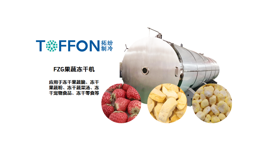 果蔬冷冻干燥机,通过将含水果蔬物料中的水分在低温下冻结成固态冰晶,随后在真空环境下,使冰晶不经过液态直接升华为水蒸气并被移除,从而获得含水率低(可达<5%)的冻干果蔬。通过冷冻干燥机能大限度地保留果蔬原有的营养成分、天然色泽、形态结构、风味及活性物质,便于常温长期贮藏和运输。