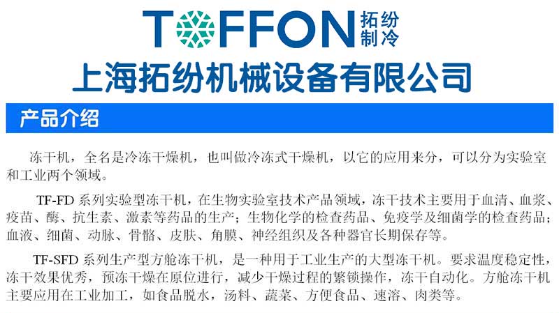 上海拓纷机械设备有限公司长期以来专注于研发和生产:冷冻干燥机,冻干机,普通型实验室冻干机,中药材实验冷冻干燥机,药膏研发冻干机,中医学院研发冻干机,冷水机,超低温冰箱,层析冷柜,程序降温仪等制冷设备,提供化工、食品及其他行业所需冷冻干燥生产线整体解决方案。